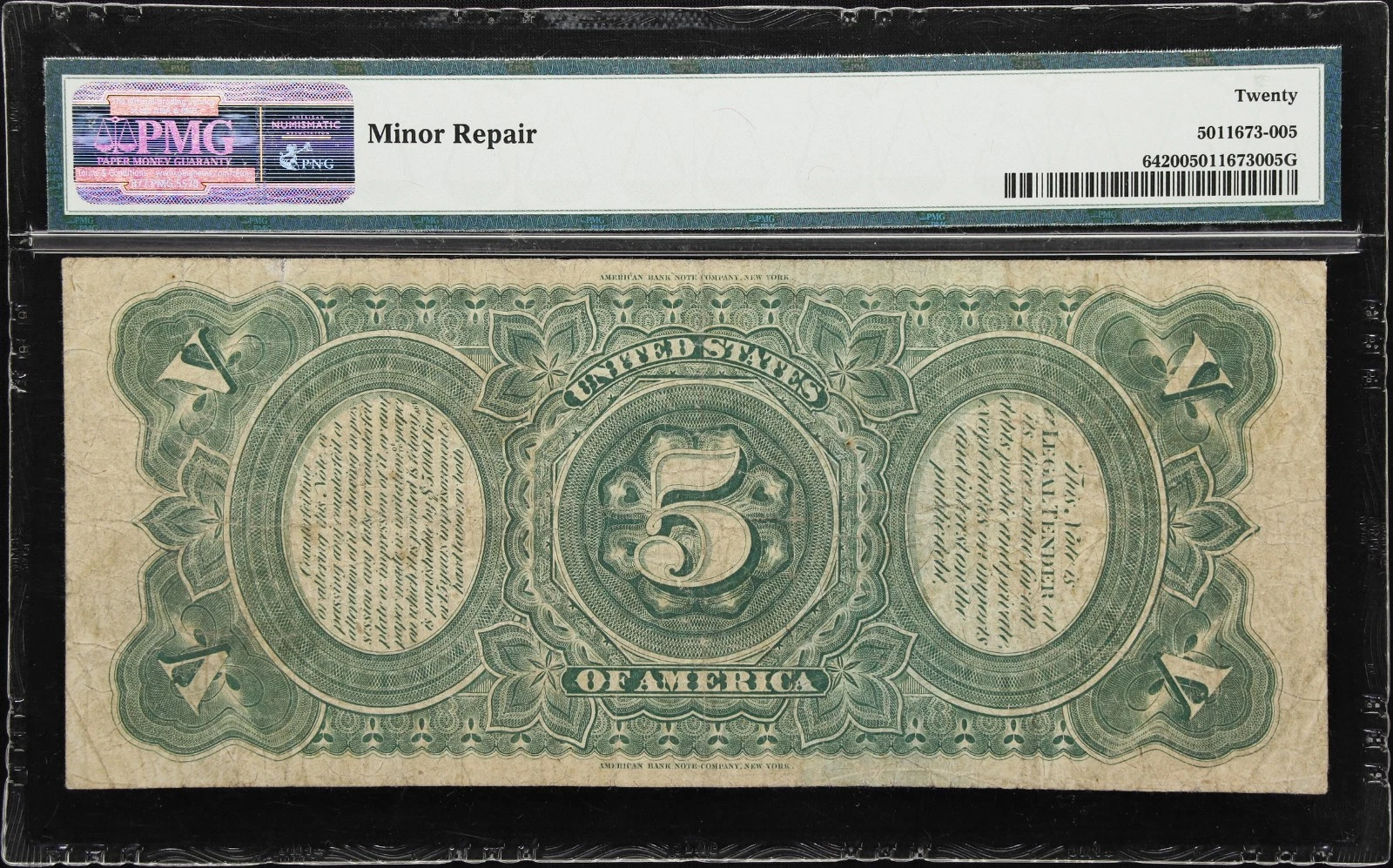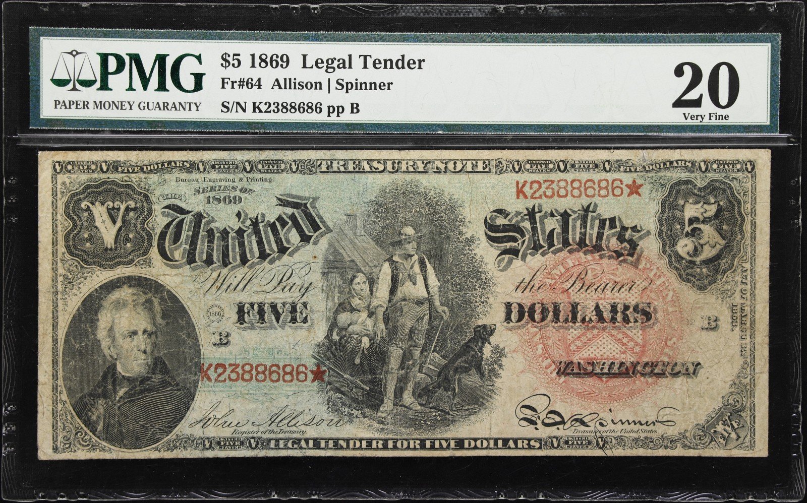 The 1869 $5 Legal Tender Note (Fr. 64), graded PMG Very Fine 20, is a visually stunning and historically significant example of classic U.S. paper money. Its legendary Rainbow design, solid mid-grade preservation, and enduring collector demand make it an exceptional acquisition for collectors of large-size currency, Legal Tender Notes, and iconic U.S. designs.