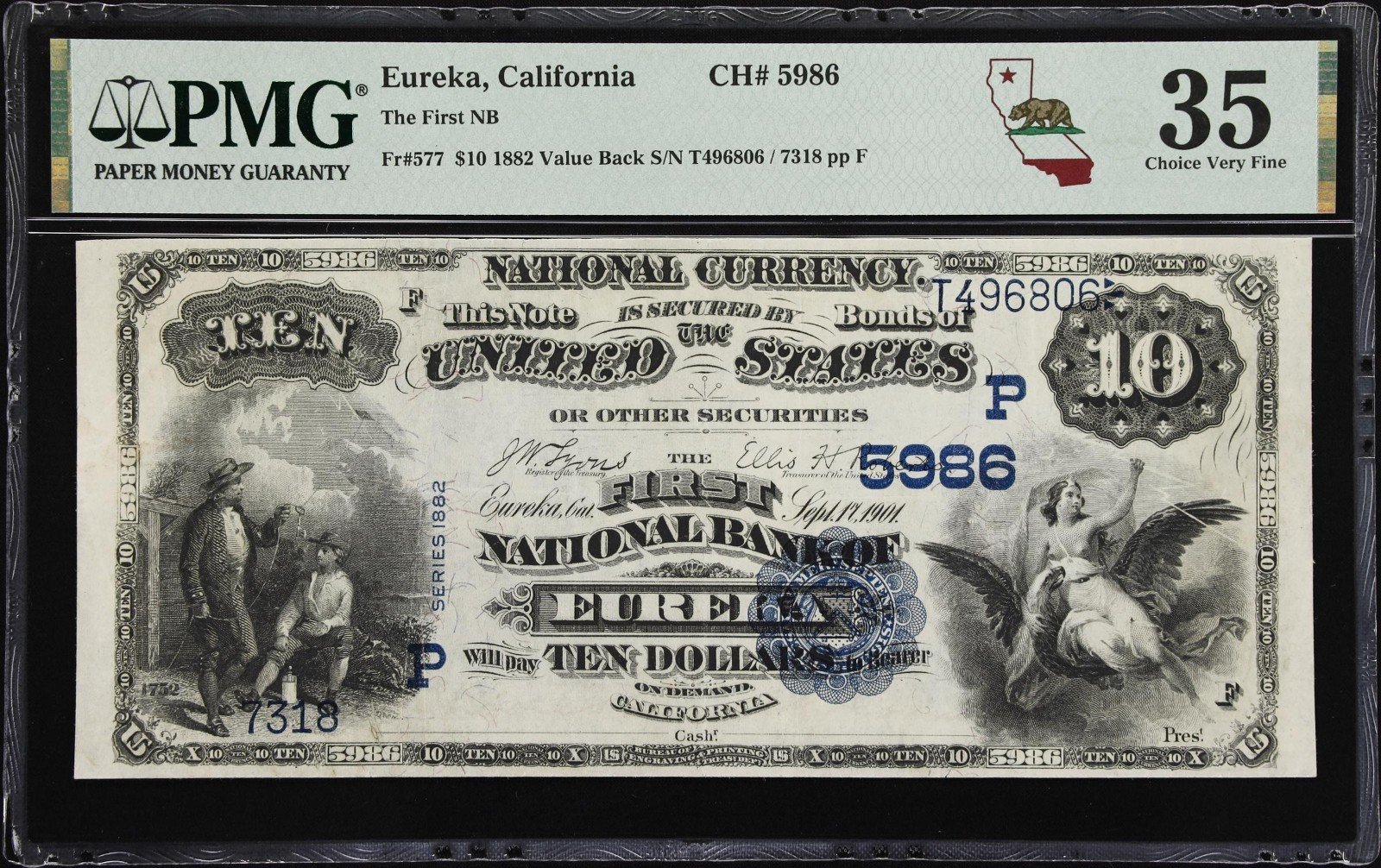 The 1882 $10 National Bank Note (Fr. 577) from the First National Bank of Eureka, California, Charter #5986, graded PMG Choice Very Fine 35, is a scarce and attractive example of classic U.S. National Currency. Its small-town California origin, premium mid-grade certification, and strong historical appeal make it an excellent acquisition for collectors of National Bank Notes, California currency, and large-size U.S. paper money.