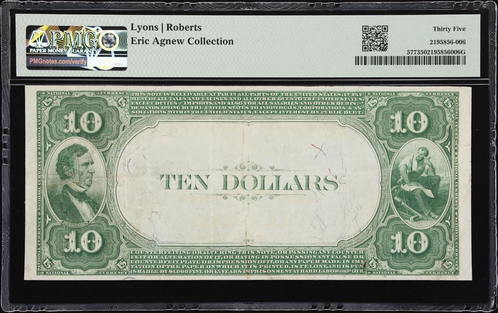 - Tag Phrase: Eureka, California $10 National Bank Note | 1882 Value Back