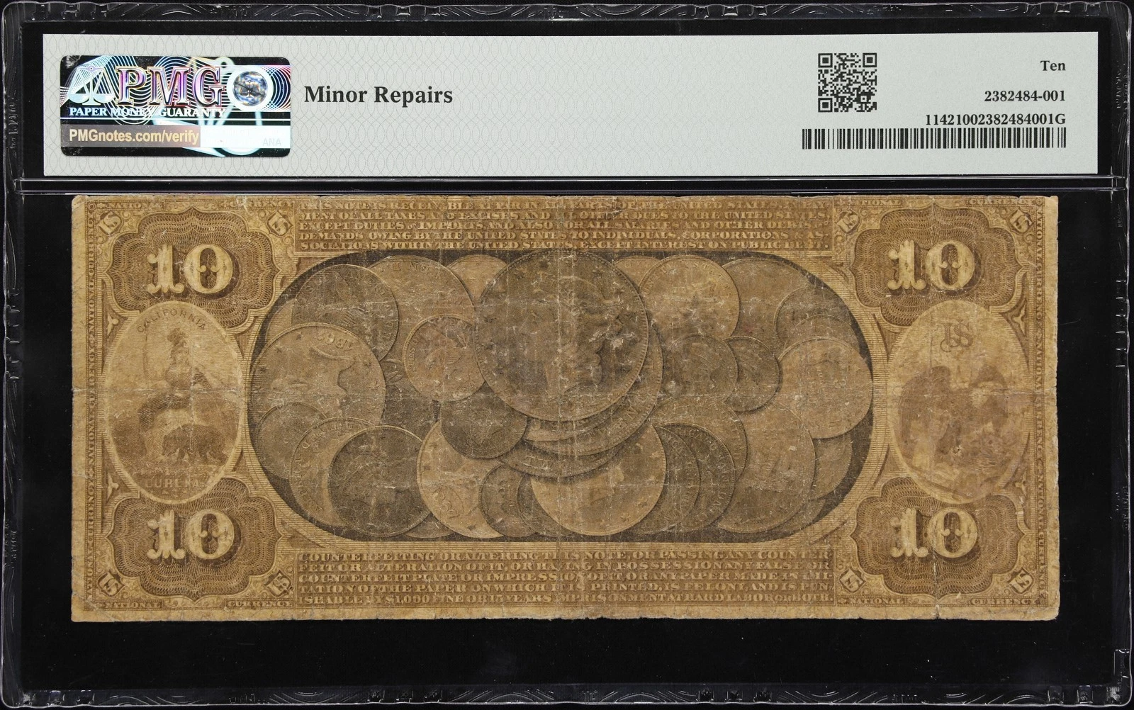 A grade of PMG Very Good 10 indicates a note that saw extensive circulation but remains fully identifiable, intact, and authentic. For 1870 National Gold Bank Notes, this grade is entirely consistent with the issue’s rarity and age.