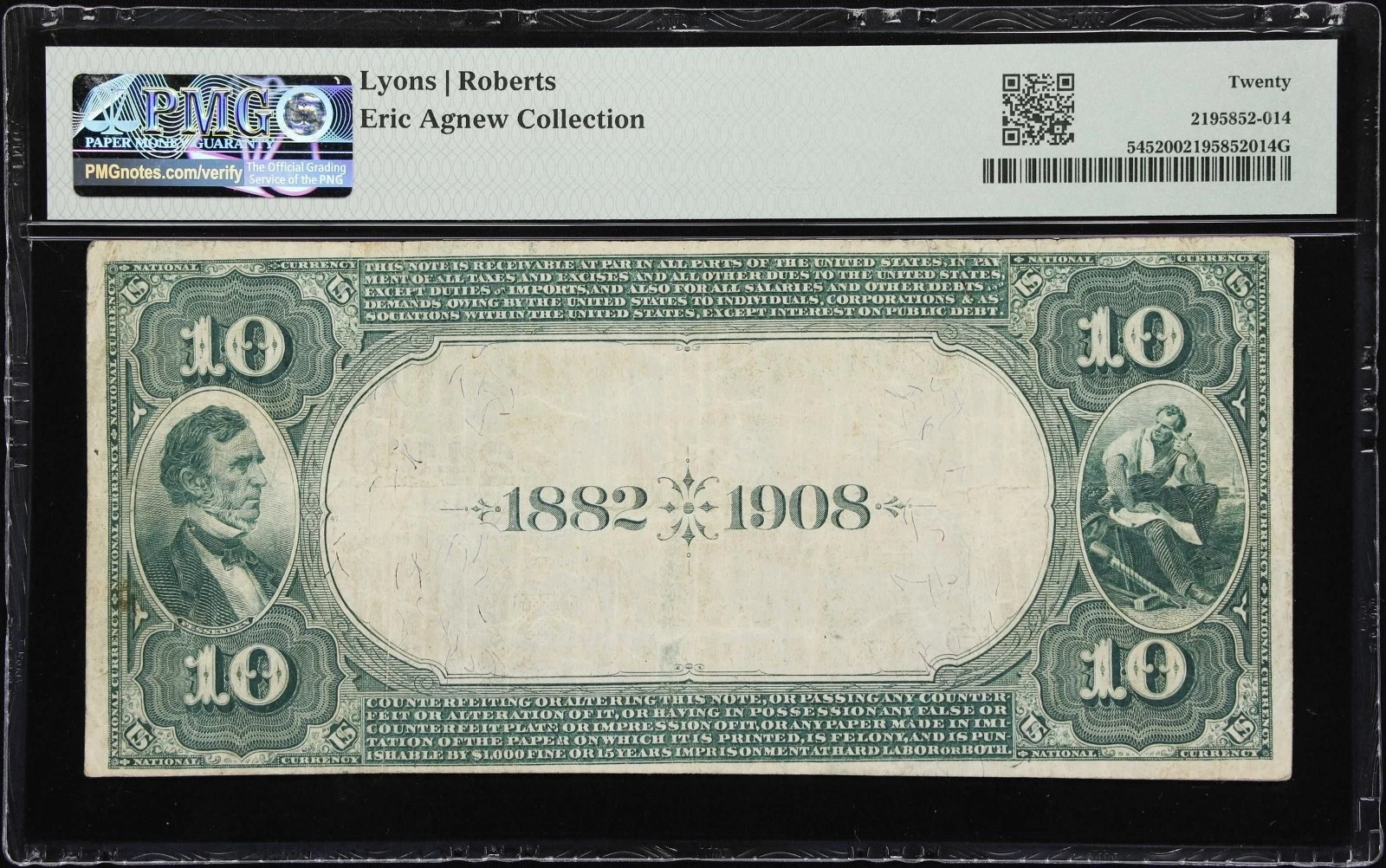 The 1882 $10 Date Back National Bank Note features: